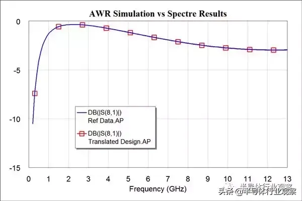 为了验证在Microwave Office中模拟的网表转换与原始Spectre结果的频率响应,将测试用例Spectre模拟的S参数导入Microwave Office进行比较。验证设置实际上与包含已翻译网表的原理图测试台相同。对于此仿真,子电路包含直接从Cadence导出的touchstone S参数块。