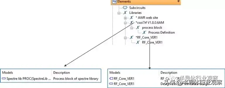 图4:翻译的Cadence代工厂PDK(左)和设计PDK(右)出现在元素树库中,可以插入任何NI AWR软件设计中