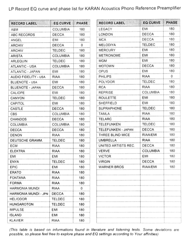 那么,何先生这次升级后重播不同唱片公司的黑胶唱片效果又如何呢?另一个问题是,如何知道手上的唱片应该对应哪个均衡曲线和相位呢?大家先来看一份表。