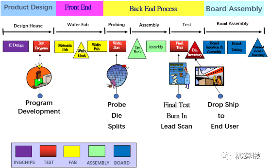 如下面这个图表,一颗芯片最终做到终端产品上,一般需要经过芯片设计、晶圆制造、晶圆测试、封装、成品测试、板级封装等这些环节。