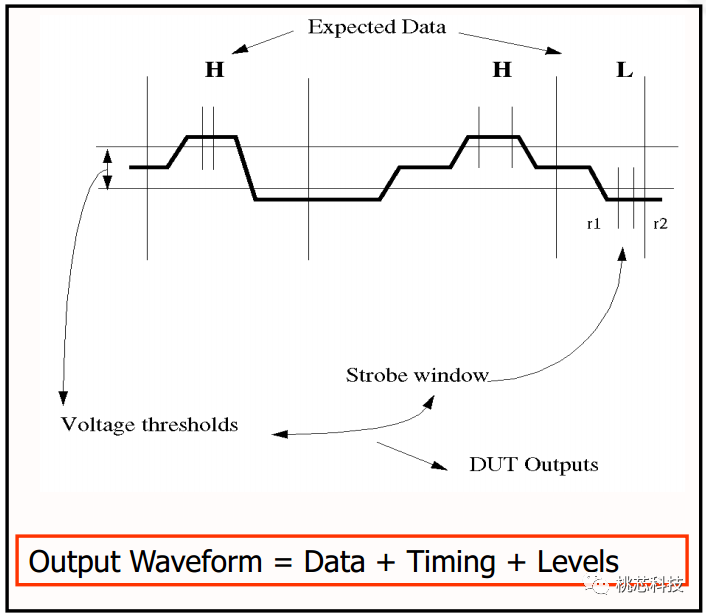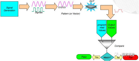 对测试机进行编写程序,从而使得测试机产生任何类型的信号,多个信号一起组成测试模式或测试向量,在时间轴的某一点上向DUT施加一个测试向量,将DUT产生的输出反馈输入测试机的仪器中测量其参数,把测量结果与存储在测试机中的“编程值”进行比较,如果测量结果在可接受公差范围内匹配测试机中的“编程值”,那么这颗DUT就会被认为是好品,反之则是坏品,按照其失效的种类进行记录。