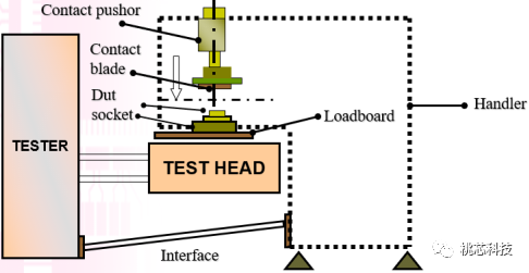 Handler 必须与 tester 相结合(此动作叫 mount 机)及接上interface才能测试, 动作为handler的手臂将DUT放入socket,然后 contact pusher下压, 使 DUT的脚正确与 socket 接触后, 送出start 讯号, 透过 interface 给 tester, 测试完后, tester 送回 binning 及EOT 讯号; handler做分类动作。
