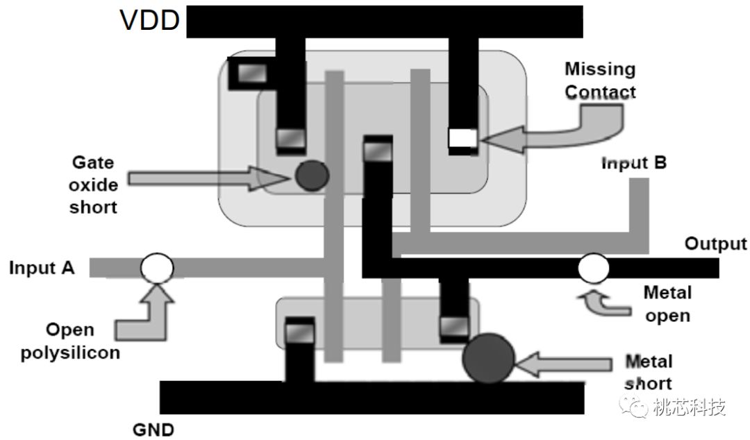 芯片在制造过程中,会出现很多种不同类型的defects,比如栅氧层针孔、扩散工艺造成的各种桥接、各种预期外的高阻态、寄生电容电阻造成的延迟等等,如下面图(1)所示,大概展示了各种基本的defects。