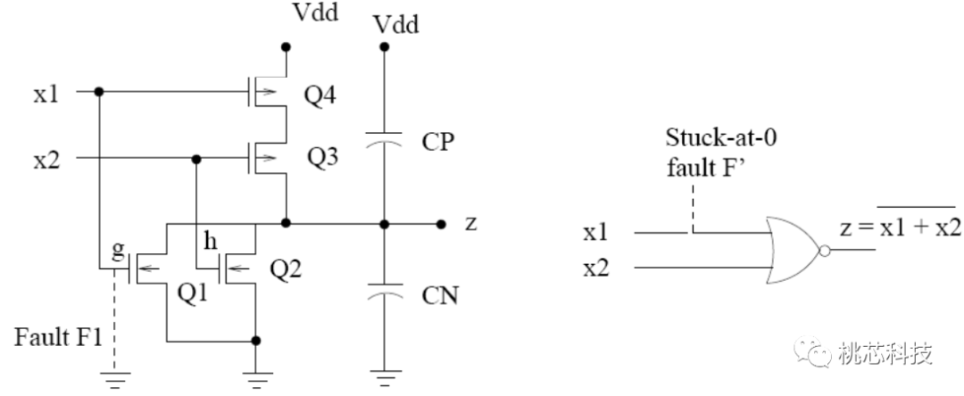 工艺制造过程中造成的硬件defects,使得某个节点Stuck At 0或者Stuck At 1, 如下面图(2)所示的一个或非门:输入节点x1发生了Stuck At 0的defect; x1和x2输入了00时候,Q1和Q2断开,Q3和Q4导通, z输出为H,正确;x1和x2输入了01时候,Q1和Q3断开,Q2和Q4导通, z输出为L,正确;x1和x2输入了10时候,此时x1被Stuck At 0了,等同于输入00,结果还是Q1和Q2断开,Q3和Q4导通,z输出为H,错误;至此,通过输入00,01,10就发现了这个defect。这种顺序输入00,01,10,而比较z输出的结果与预期的值进行判断的方法,就是所谓的Function测试。