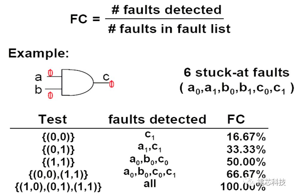 那么如上面图中列出的,需要输入(1,0),(0,1),(1,1)可以完全测试出所有的6种可能的Stuck-at Faults的情况,测试覆盖率为:可以发现的faults/所有可能的Faults,上面的输入的测试覆盖率为100%。
