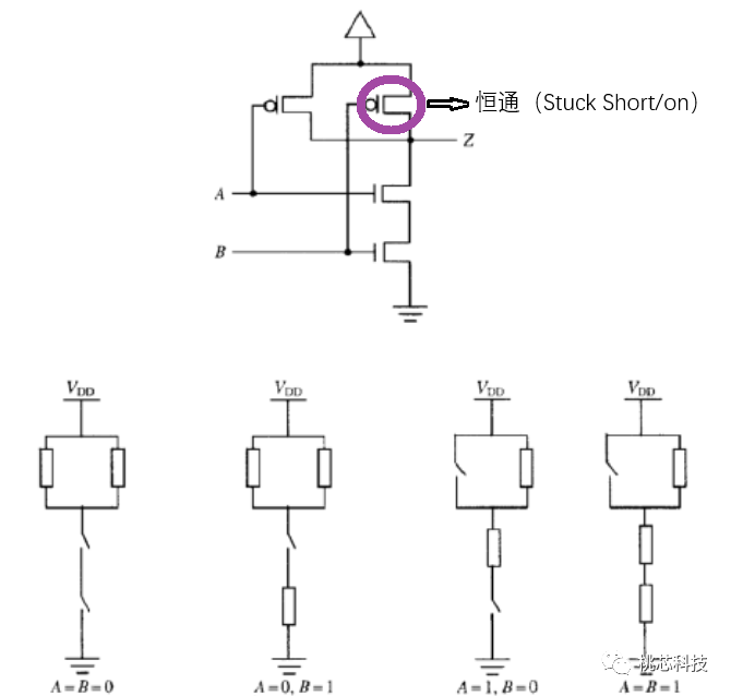 如下面图(5)上半部分所示,右边的那个P沟道MOS管发生了Stuck short(on)的faults,图的下半部分展示了输入AB的四种不同的情况,当AB输入为00时,看起来这个晶体管表现的正常;但是当AB输入为11时,地和电源间存在一个直接导通的电路,输出端Z的状态是异常的。
