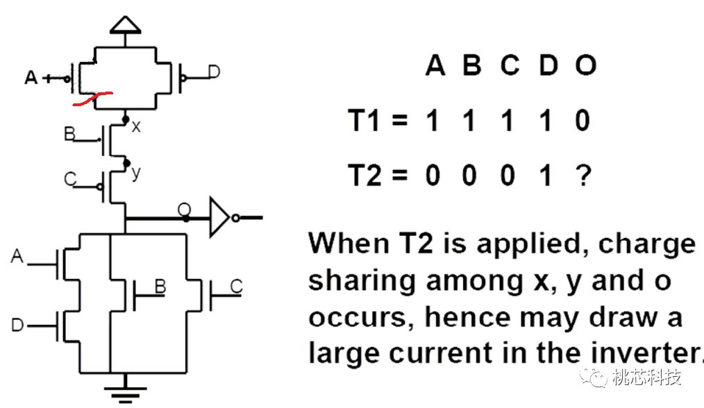 上面红色表示open的缺陷,当输入ABCD为1111时,输出O为0,当输出转为0001时候,在x、y和o之间出现了充放电,会有大电流出现。