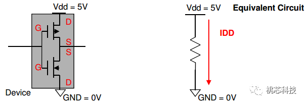 IDD测试(或者叫做ICC测试),在CMOS电路中是测试Drain to Drain的流动电流的,在TTL电路中是测试Collector to Collector的流动电流。如下面图(20)所示: