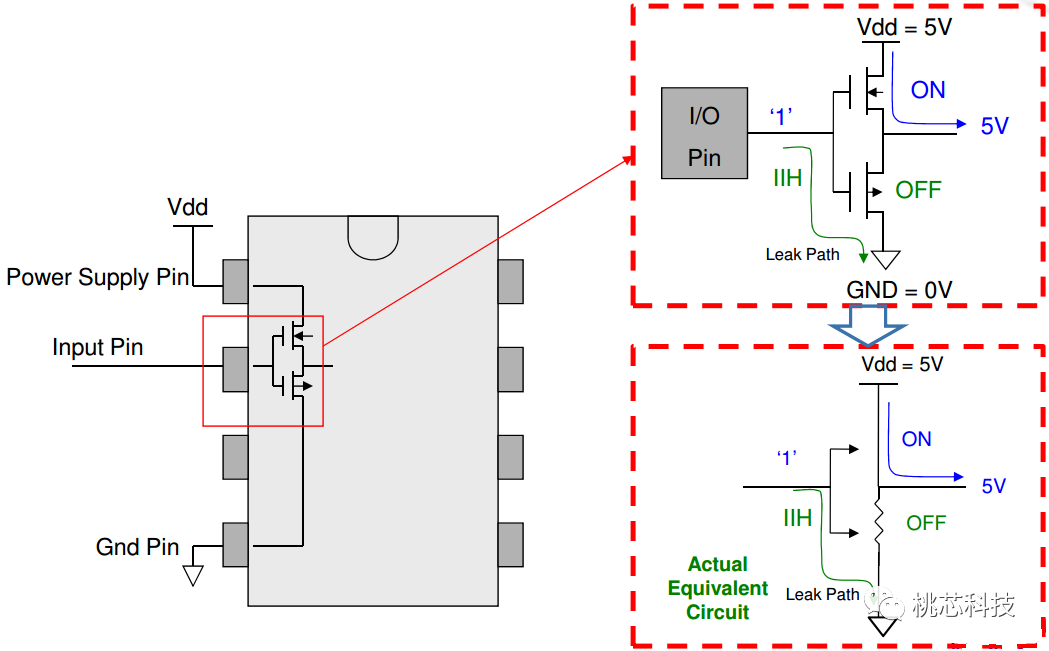 IIH是当芯片的某个input pin被设定为输入VIH时,从这个input pin到芯片的ground之间的漏电流,如下图(24)所示