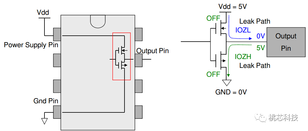 Tristate表示的是输出pin是高阻状态,当这个时候,如果输出pin上有电压VDD,那么从输出pin到芯片的ground上会有漏电(IOZH);如果输出pin接地,那么从芯片的VDD到这个输出pin上也会有漏电(IOZL),如下面图(26)所示,这些漏电必须保持在spec规定的范围内,以确保芯片的正常工作,不会有潜在的defect产生。