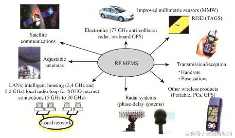 RF MEMS是指利用MEMS/NEMS技术微纳精细制造实现的射频微波结构、器件、单片集成子系统等。它具有小型化、低功耗、低成本、集成化等方面的优势,逐渐广泛应用于军民各领域,包括:①个人通讯,如移动电话、PDA( Personal Digital Assistant)、便携式计算机的数据交换;②车载、机载、船载收发机和卫星通信终端、GPS接收机等;③信息化作战指挥、战场通信、微型化卫星通信系统、相控阵雷达等。图1为RF MEMS应用领域示意图。