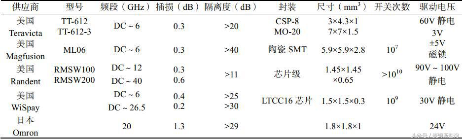 RF MEMS开关及衍生器件大量应用在射频微波单机和系统领域,如美国Randent MEMS公司、RockWell公司、MEMTronics 公司(从Raython公司独立出来)生产的基于开关的产品大量应用于DARPA和NASA主导的军事用途设备和系统中,日本Omron公司、美国WiSpry公司(被瑞声科技收购)生产的开关系列产品应用于民用领域,包括智能手机、导航终端、物联网等。目前商业化的MEMS开关产品比较见表2。