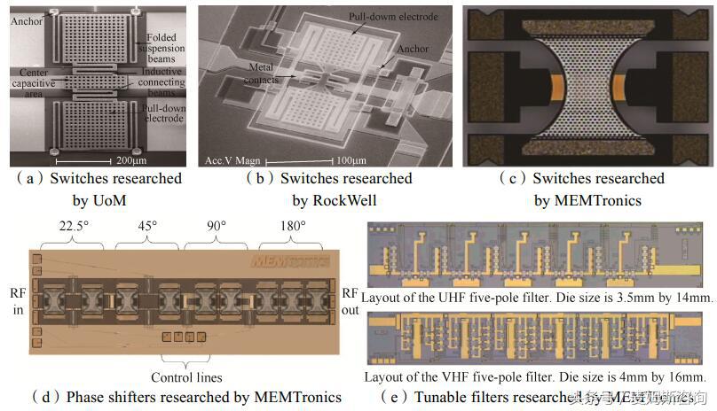 从技术层面上,RF MEMS主要包括: ①由微机械开关、可变电容、电感、谐振器组成的基础结构单元层面;②由移相器、滤波器、VCO等组成的组件层面;③由T/R组件、单片接收机、变波束雷达、相控阵天线等组成的应用系统层面。下面主要从器件层面介绍RF MEMS现状和发展趋势,基础结构单元是组成器件的要素,片上集成子系统是器件发展的趋势。