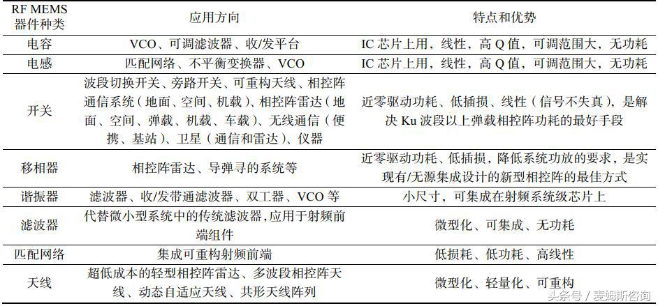 RF MEMS器件主要有:①基于开关基本结构单元的移相器、可调滤波器、可变波束天线等,应用于相控阵雷达系统、平面阵列扫描天线等;②硅基/熔融石英基的高性能滤波器,应用于军用雷达/卫星通信、电子对抗等;③超小型化的声波滤波器(SAW、FBAR),大量应用于手机、无线人机交互设备、导航、微纳卫星等;④微纳电感、电容结构组成的天线阵列,用于雷达、电子对抗等;⑤微纳传输线/波导结构(如微同轴结构)组成的高性能T/R组件等。各类RF MEMS器件及其应用方向和优势特点见表1。