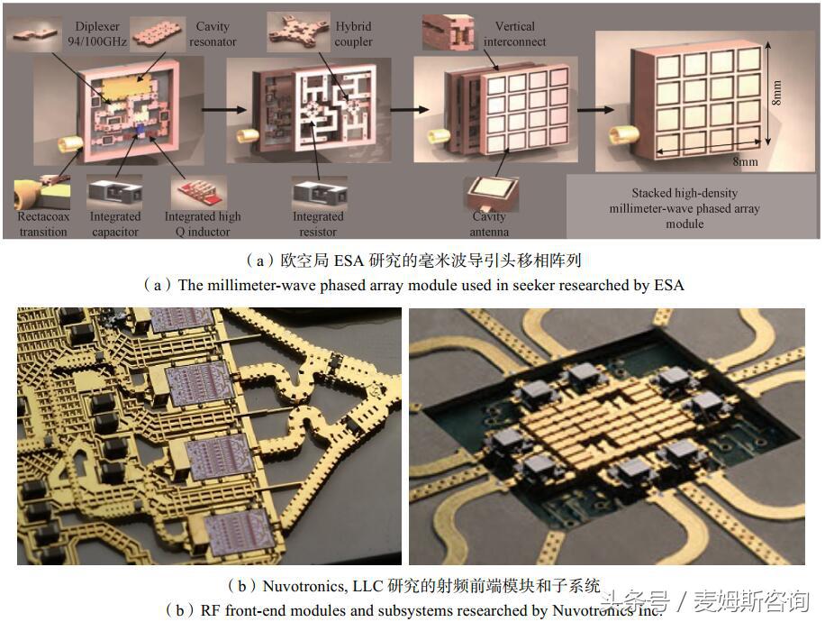 ④集成化程度进一步提高,例如各类无源器件(低损微型传输线、滤波器、移相器、功分器、耦合器、阻抗匹配网络、天线等)的单片集成,无源器件与射频微波前段有源低噪声放大芯片的异质集成等。