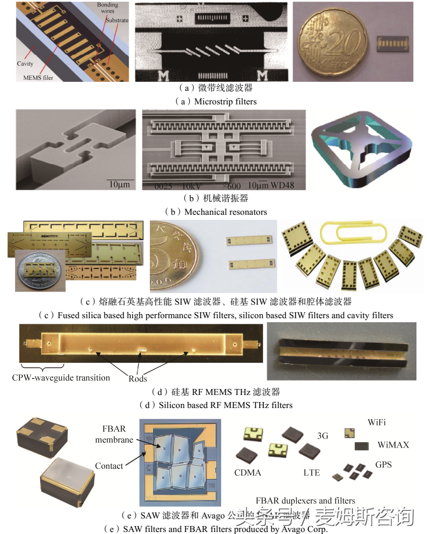 针对高性能指标、高可靠性、高功率容量的军工市场需求,RF MEMS滤波器主要有:①微带线滤波器;②硅基SIW和腔体滤波器,国内中电13所和55所研制的该类型产品已达到实用化程度;③MEMTronics公司的高性能熔融石英SIW滤波器,主要供应军工高端市场;④Avago公司FBAR和TriQuint公司BAW滤波器,主要针对超小体积、高性能的应用领域,如智能手机、消费电子无线终端、微纳卫星等。
