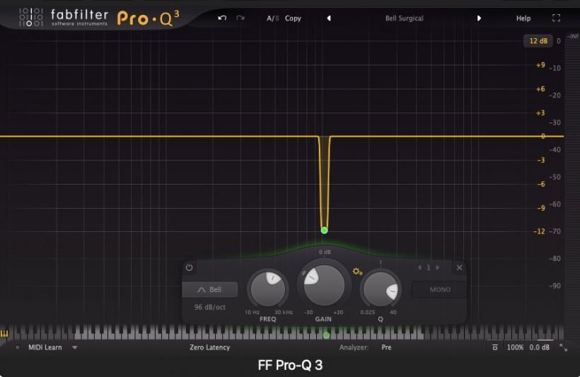 使用“陷波”(Notch)式EQ能够有效处理有着特定频率的噪声。FabFilter Pro-Q 3就能够为您提供手术刀般精密准确的、曲线斜率非常陡峭的陷波滤波功能。