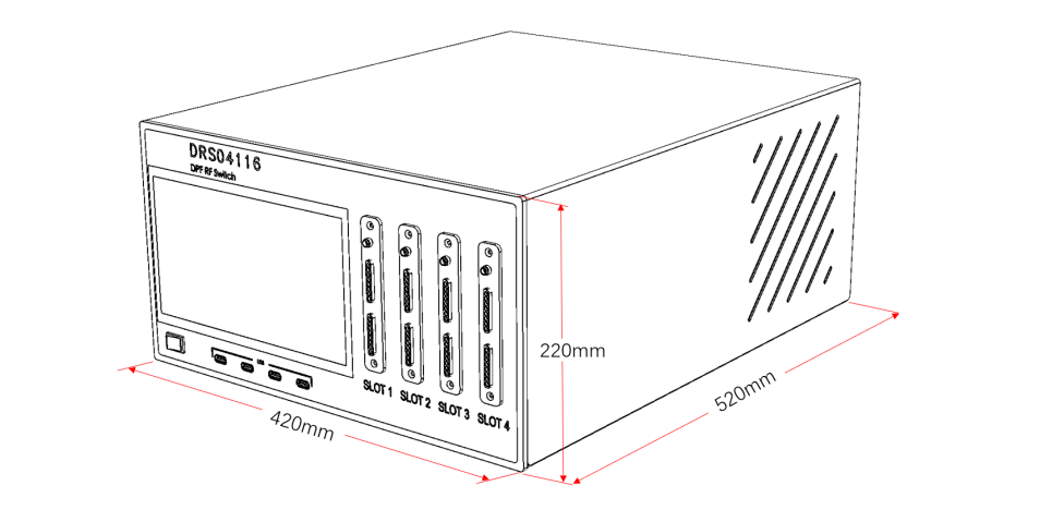 标准款 RF Switch 系统符合标准机柜 5U 尺寸的安装要求。定制款高度可以做到 7U 以上。 标准款设备面板宽度 420mm,高度 220mm,设备深度 520mm。