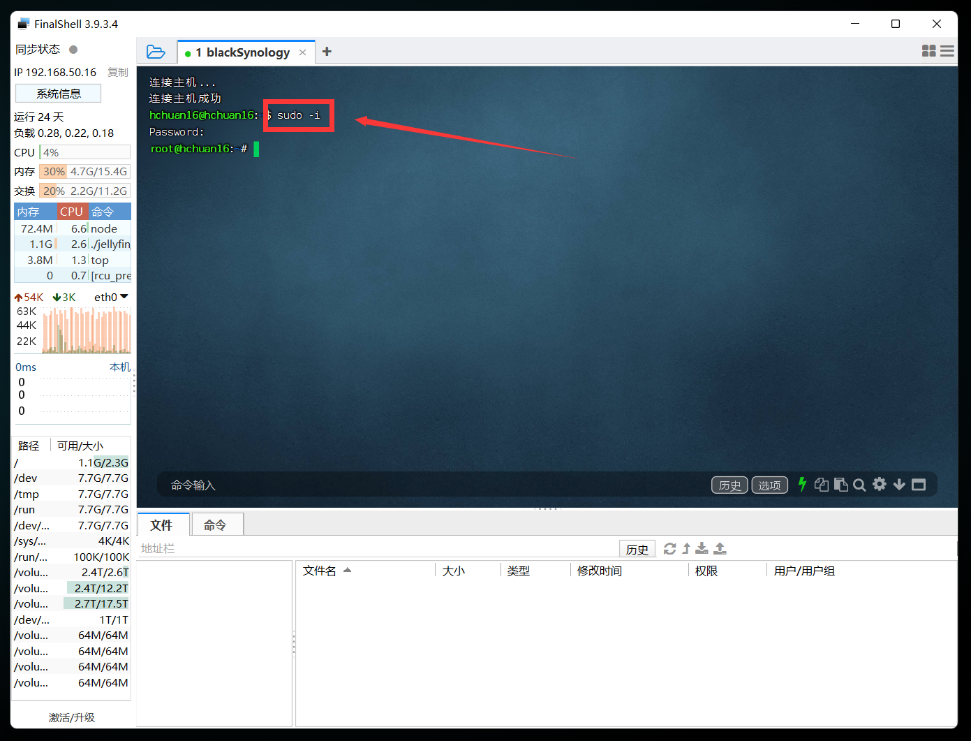 接着输入NAS的登录密码(看不见),回车,这时候就用管理员身份登录了。