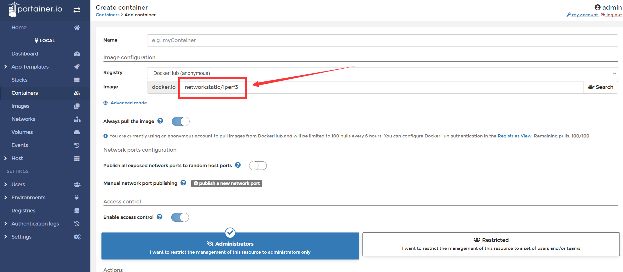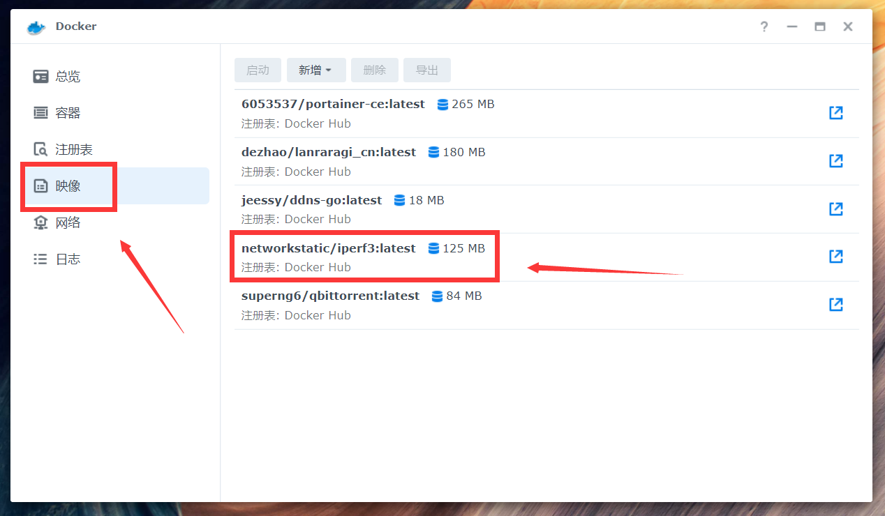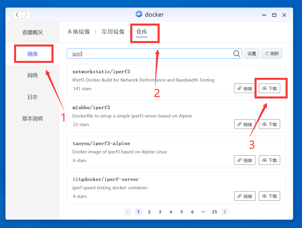点击镜像,搜索iperf,找到networkstatic/iperf3,下载之。