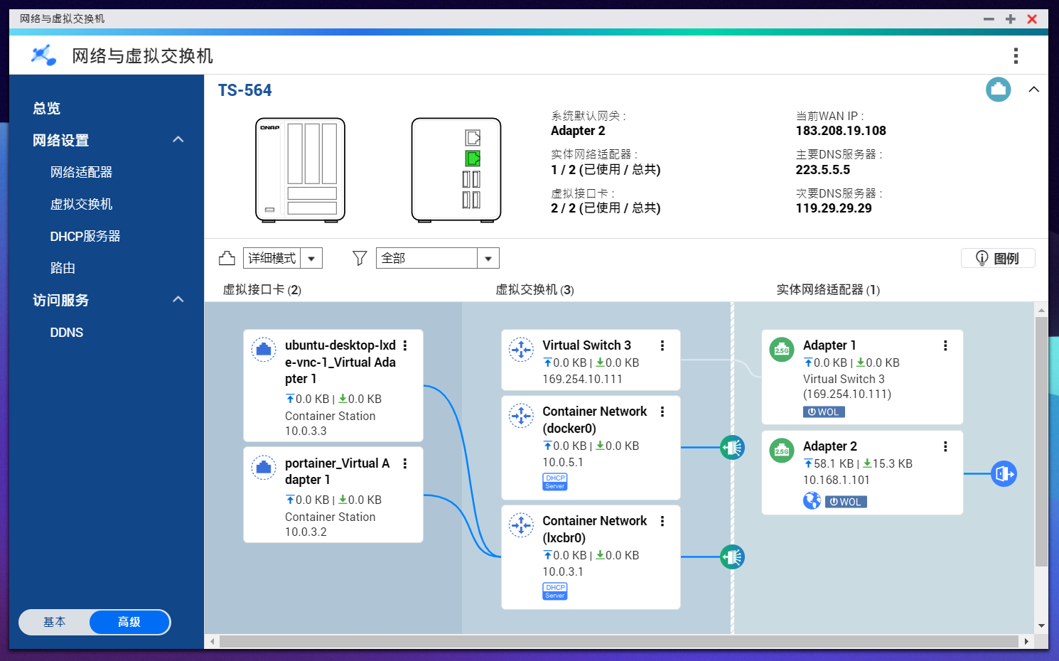 查看这台威联通564C的IP,后续对打时候需要用到,点击系统状态中的网络状态,IP在下图红框处: