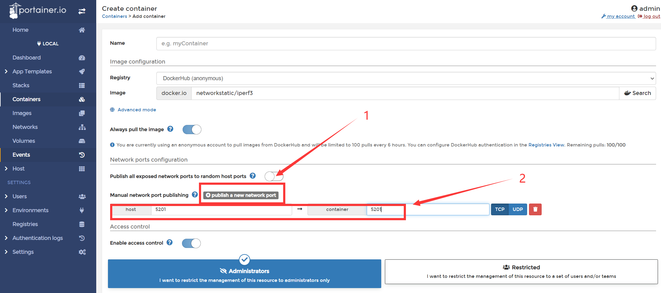 点击publish a new network port,host和container的端口号都填写: