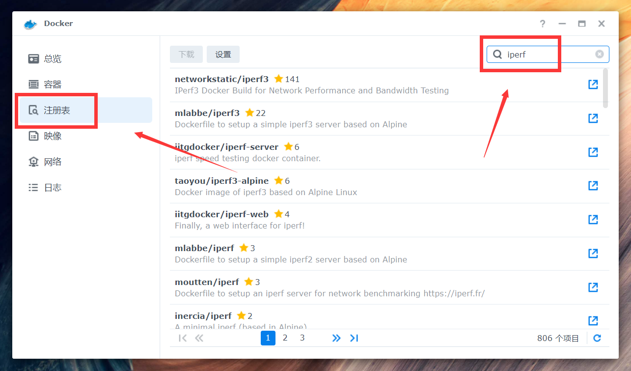 进入群晖的Docker管理器后,点击注册表,搜索iperf,找到networkstatic/iperf3双击下载。