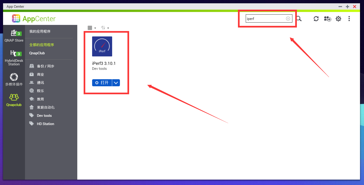 搜索栏搜iperf,点击安装,安装完成后默认为服务端,无需做任何其他配置。