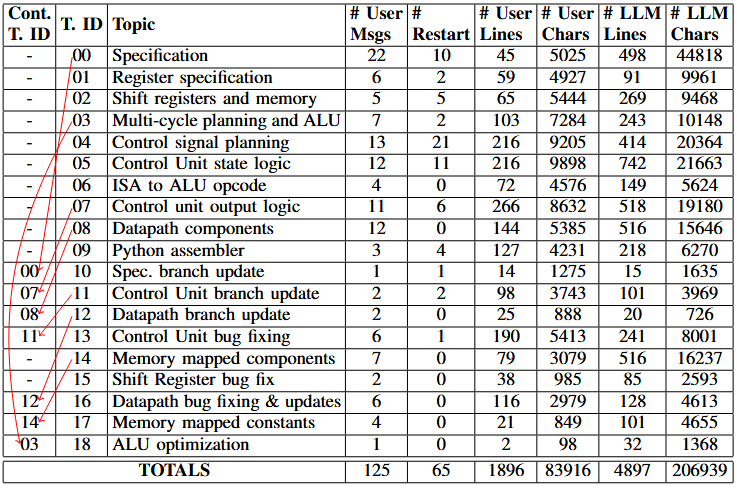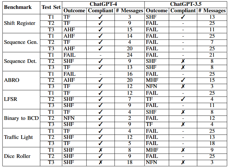 一旦设计经过编译和仿真且没有失败的测试用例,就被认为是成功的。然而,如果高级反馈无法修复错误,或者用户需要编写任何 Verilog 来解决错误,则测试将被视为失败。如果对话超过 25 条消息(符合 OpenAI 每 3 小时 ChatGPT-4 消息的速率限制),则测试也被视为失败。