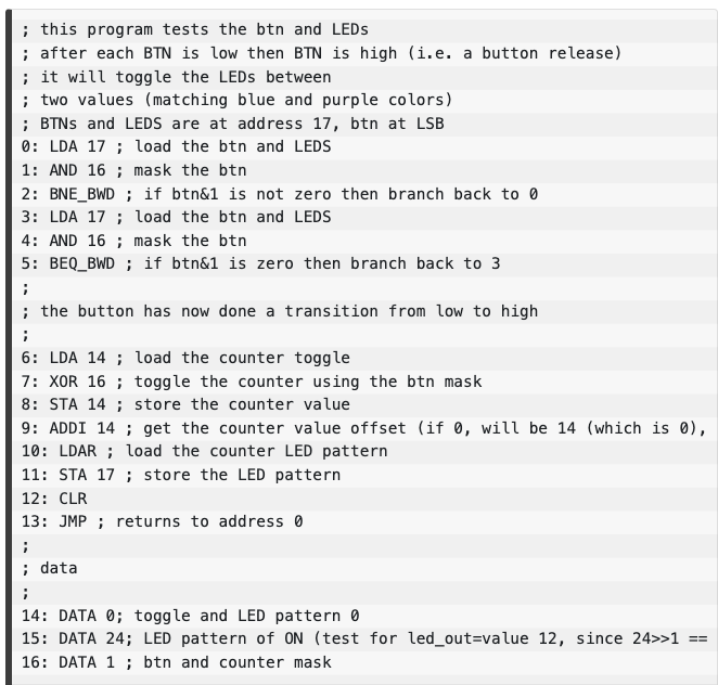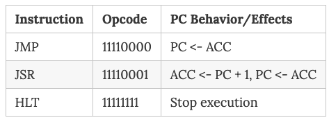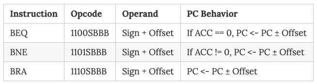 分支指令有限制但很有用。向后跳过两条指令可以实现高效轮询(例如加载输入,屏蔽相关位,然后检查是否为 0)。向前跳过 3 条指令可以跳过 JMP 或 JSR 所需的指令。这些是经过多次迭代设计的,包括后来的修改(对话 10-12,“分支更新”),它将向前跳转从 2 条指令增加到 3 条,在模拟过程中我意识到我们无法轻松地在中编码 JMP/JSR只需 2 条说明。