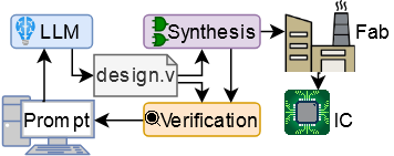 然后,我们设计了两种方法。第一种方法是尝试让 LLM 在一种反馈循环中完成所有事情,即 LLM 将获得一份规范,然后为该设计生成设计和测试。然后,人类将在模拟器 (iVerilog) 中运行测试和设计,然后将任何错误返回给 LLM。