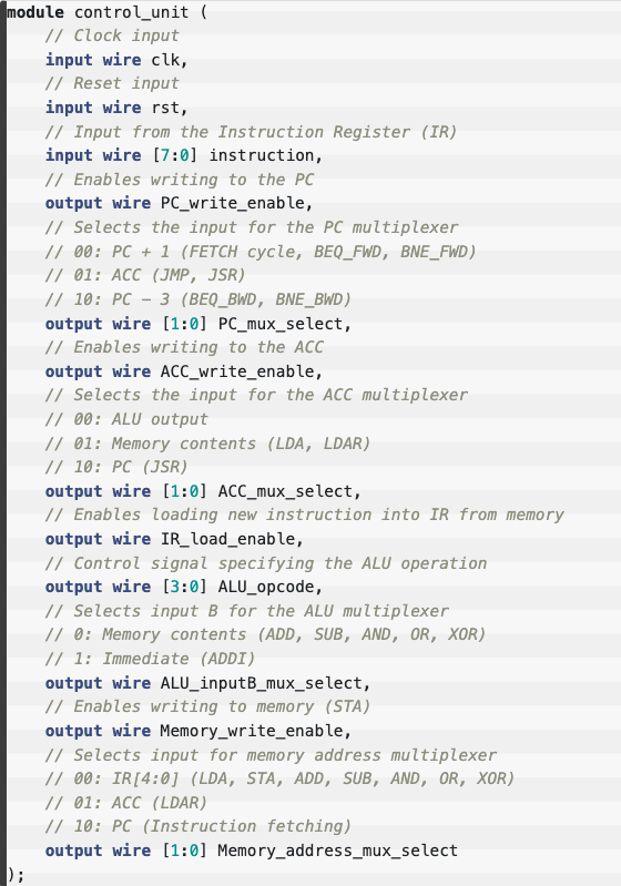 This looks excellent. According to this list, please produce the module definition for a control unit in Verilog which could operate the processor datapath. Please comment the purpose of each I/O. If a signal is for controlling a multiplexer, please also comment what each possible value should correspond to in the datapath.