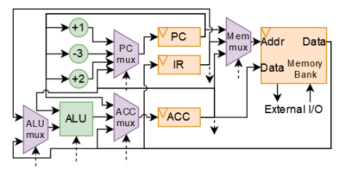 Let us make a brand new microprocessor design together. We're severely constrained on space and I/O. We have to fit in 1000 standard cells of an ASIC, so I think we will need to restrict ourselves to an accumulator based 8-bit architecture with no multi-byte instructions. Given this, how do you think we should begin?