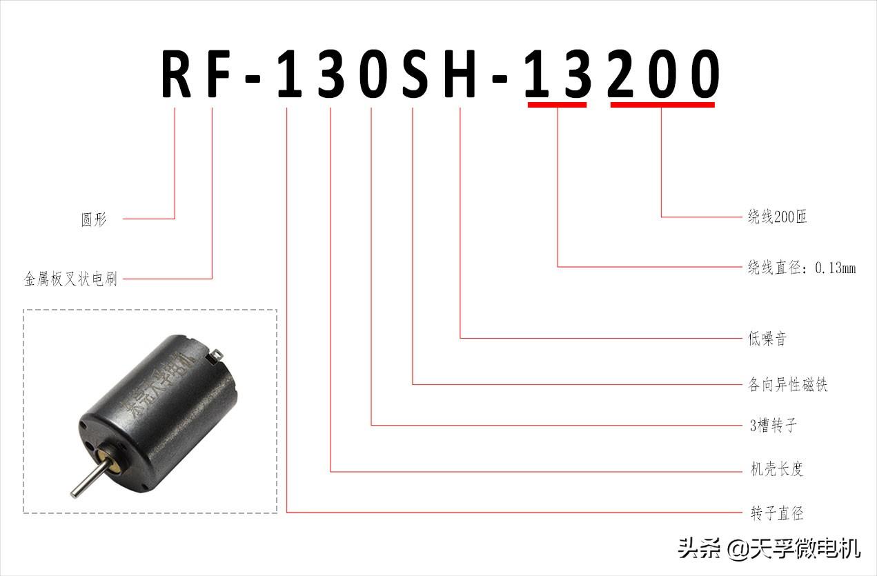 下面我们来了解下市场通用型号,微型电机的型号是数字和字母形式的组合,之前我们有讲过微型电机数字字母的意思,但还是有的人不是很明白,这里我们来详细的拆解下如 RF-130SH-13200微型电机