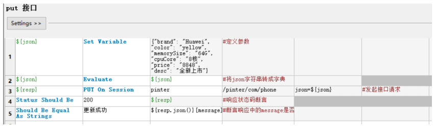 由于json格式参数通常比较多,所以我们将他定义成了普通变量,但是接口关键字请求时json参数 必须是字典格式,所以使用Evaluate关键字将字符串形式的json参数转换成字典