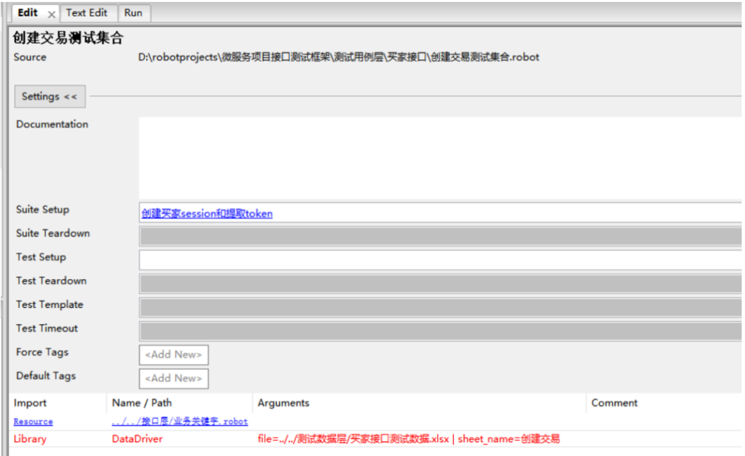 创建测试集合apidatadriver,导入库RequestsLibrary和DataDriver,注意导入DataDriver时要写参数,导入后标红的话先不用管,继续做
