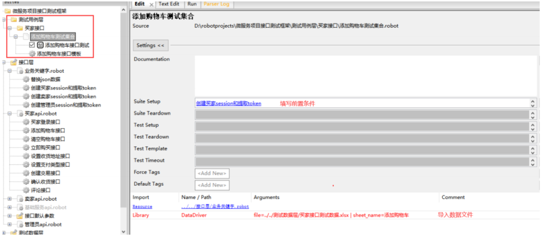 买家api :这是一个Resource,创建是右键接口层New Resource卖家api :这是一个Resource,创建是右键接口层New Resource管理员api :这是一个Resource,创建是右键接口层New Resource基础服务api :这是一个Resource,创建是右键接口层New Resource接口默认参数 :这是一个目录,当接口参数比较多时,用来存储默认参数的,存到文件里, 方便管理业务关键字 :这是一个Resource,用来封装一些自定义的业务关键字,创建是右键接口层 New Resource测试用例层: 这是一个目录,用来管理所有测试用例