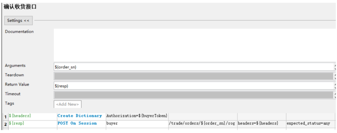 在[接口默认参数]目录中创建一个 创建商品.json文件,内容写所有参数的默认值 关键字入参的含义: ${new_params}给了一个默认值,表示可以不传,不传时接口使用默认参数发起请求,如果用户需要针对默认json参数里的某些字段进行修改,${new_params}的传递规则是字符串形式的json格式字符串,key必须是jsonpath表达式,value是要替换的新值例如 脚本解释 第一行:读取默认参数第二行:判断有${new_params}不等于default,说明用户传了其他数据第三行:判断有${new_params}不等于default,调用[替换json数据]关键字替换并返回3、确认发货接口