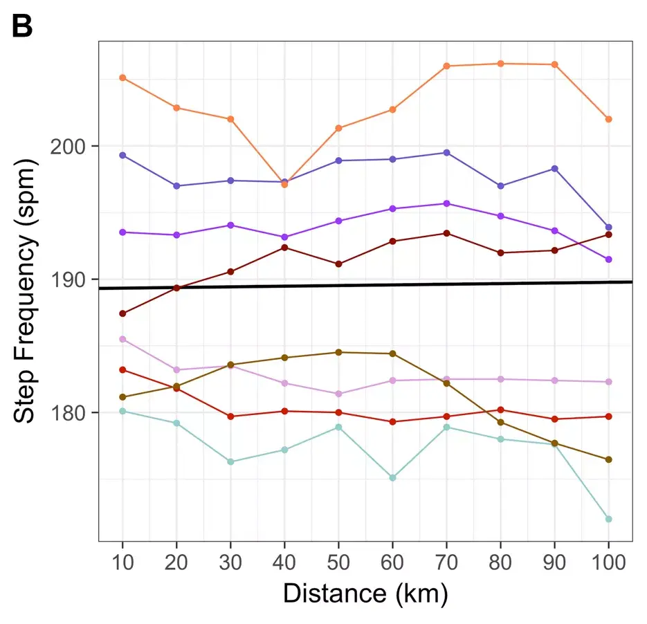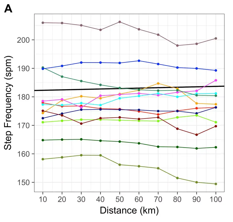 Burns GT, Zendler JM, Zernicke RF. Step frequency patterns of elite ultramarathon runners during a 100-km road race. J Appl Physiol (1985). 2019 Feb 1;126(2):462-468. doi: 10.1152/japplphysiol.00374.2018. Epub 2018 Dec 13. PMID: 30543498.