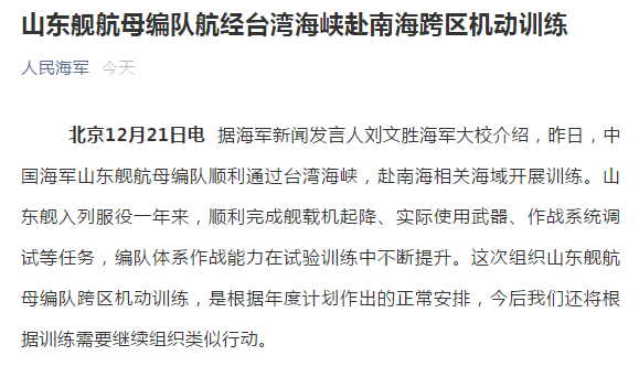 东方网·演兵场长12月21日报道:据海军新闻发言人刘文胜海军大校介绍,昨日,中国海军山东舰航母编队顺利通过台湾海峡,赴南海相关海域开展训练。山东舰入列服役一年来,顺利完成舰载机起降、实际使用武器、作战系统调试等任务,编队体系作战能力在试验训练中不断提升。
