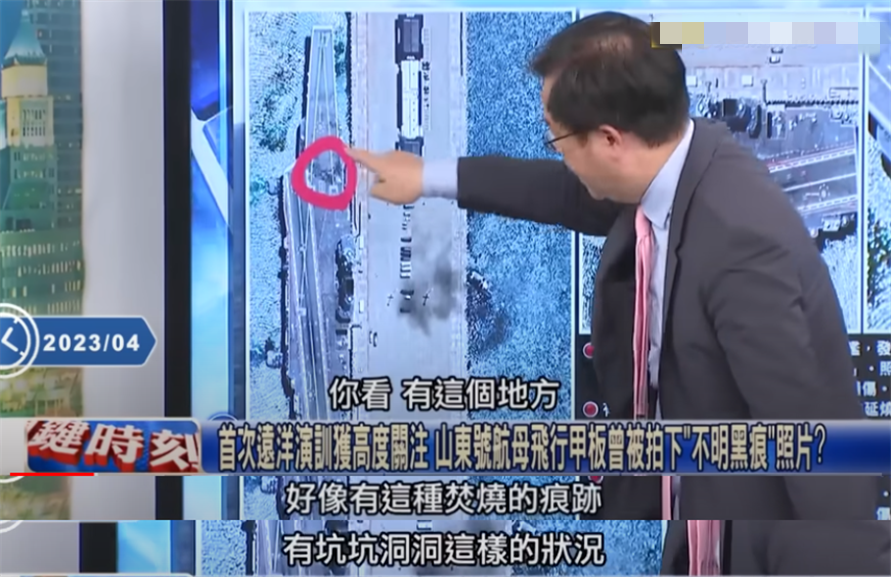 台媒专家又拿着2021年拍摄的航母甲板照片来说2023年的山东舰,甲板上有一大片漆黑,说是我舰载机在降落的时候发生了爆炸,导致甲板破的大洞。而且,跑道上也有很多漆黑掉漆的地方,说明大陆航母的质量不行,舰载机起飞几次就蹭掉漆了......