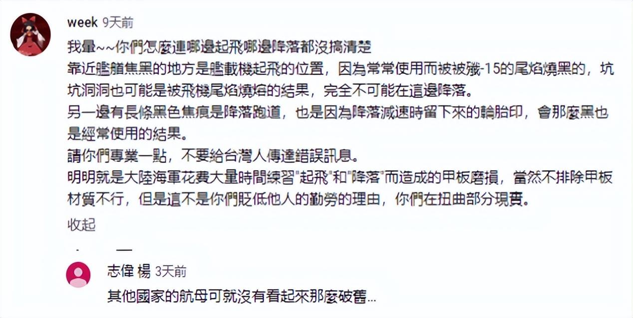这个抹黑手段其实挺低级的,所以节目下方还有懂军事的网友发消息解释为什么航母甲板会漆黑掉漆,然而其他人并不相信他的话。