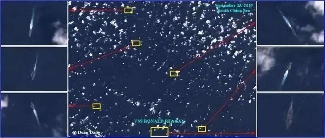 ▲5艘中国军舰近距离围观美国里根号航母的卫星图