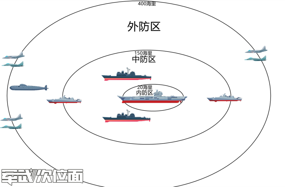 外防区,又称纵深防御区,距离航母150-400海里,由舰载机、侦察机、预警机、反潜机、潜艇进行防御。