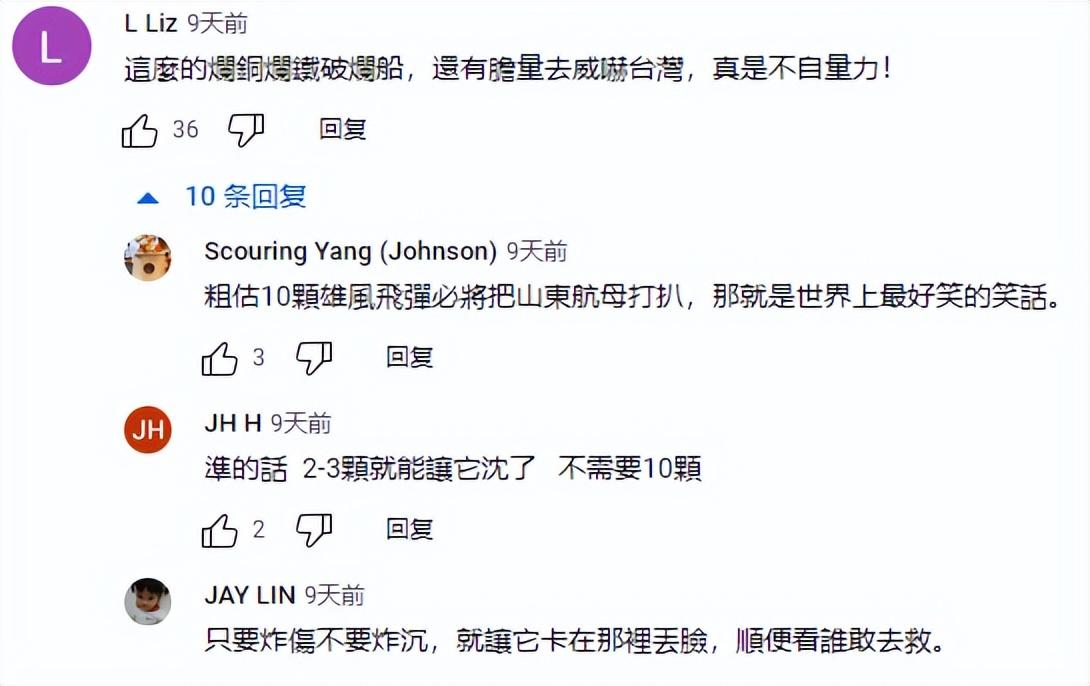 如此低端的抹黑操作,明眼人基本都是把它当相声看,但是台湾的很多观众是信以为真的,这期节目的下方留言中,台湾网友一片兴奋,自信满满大肆嘲讽大陆航母。