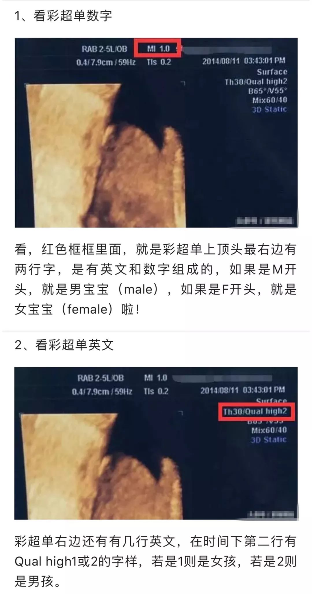 彩超单右边还有有几行英文,在时间下第二行有Qual high1或2的字样,若是1则是女孩,若是2则是男孩。