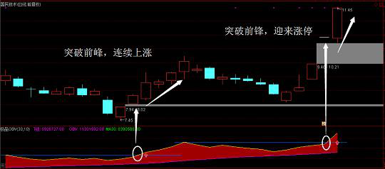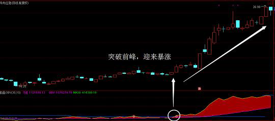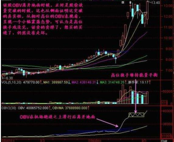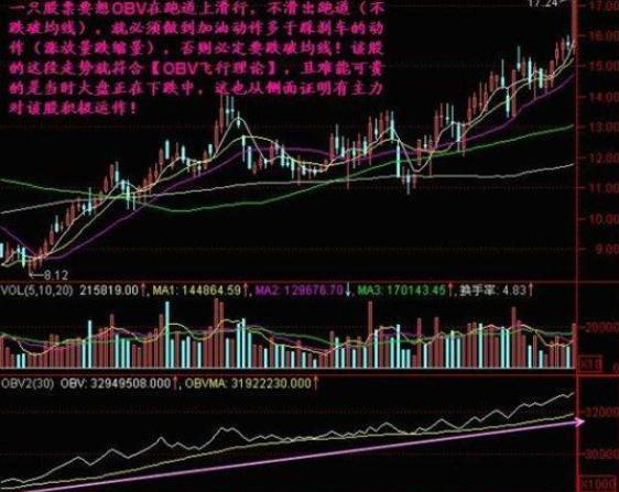 当主力筹码吸收充分后,突然有一天OBV线从地平线上升起,且角度大于45度以上;此时我们观察成交量和移动平均线的变化,当日成交量大于5日成交量,5日成交均量大于10日成交均量,5日移动平均线金叉10日移动平均线或5日移动平均线已在10日移动平均线上方运行。