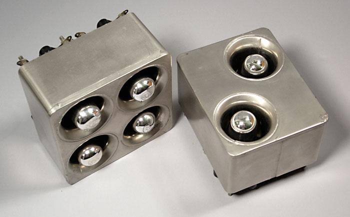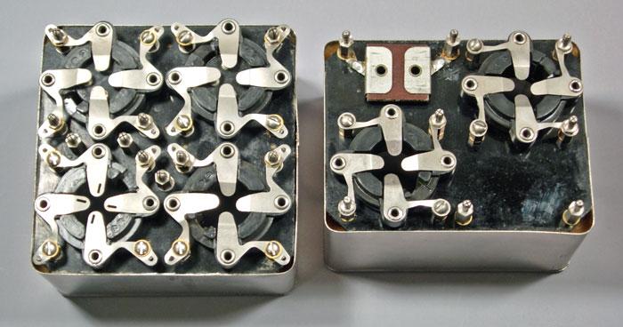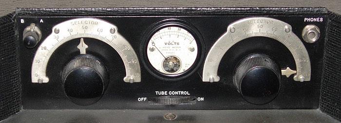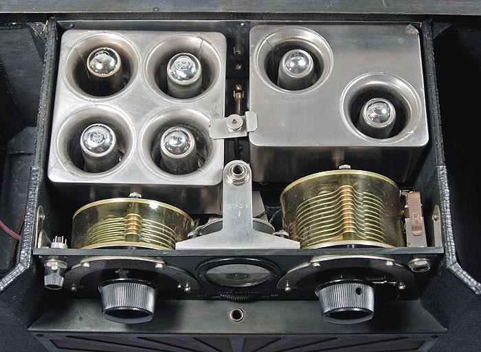拆下天线和盖板后,显示出独特的内部结构。两个装有蜡并密封的插入式模块为六个UV-199管提供插座。这些罐内是音频和RF变压器。电池盒位于两侧。提供两个调节控制器,指轮控制器设定灯丝电压。提供面板仪表以监测灯丝和板电压。
