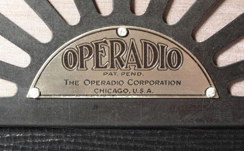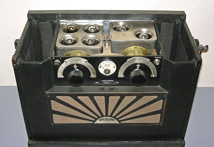 这台收音机是由Operadio公司于1925年制造的。它是一个独立的便携式设备,内置喇叭扬声器,电池和环形天线。