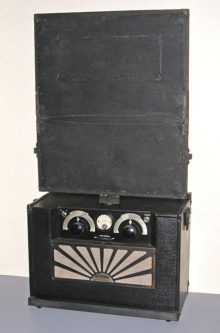 木柜上覆盖着橡胶布,类似于当时用于汽车屋顶的材料。 “朝阳”烧烤造型非常具有吸引力,并将此套装作为首批真正的装饰艺术收音机之一。